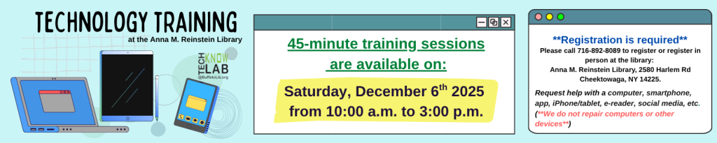 Having any tech issues? Need assistance with your computer / tablet / phone? Sign up to get one-on-one assistance. Call us at (716) 892-8089 or stop in to sign up. Limited appointments, 45 minutes only.