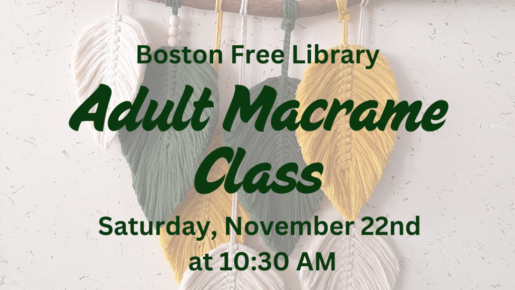 Join us for a fun morning macrame craft! We will be making beautiful macrame wall hangings. All supplies provided for free to pre-registered attendees. Call 716-941-3516 to register to attend - space is limited!