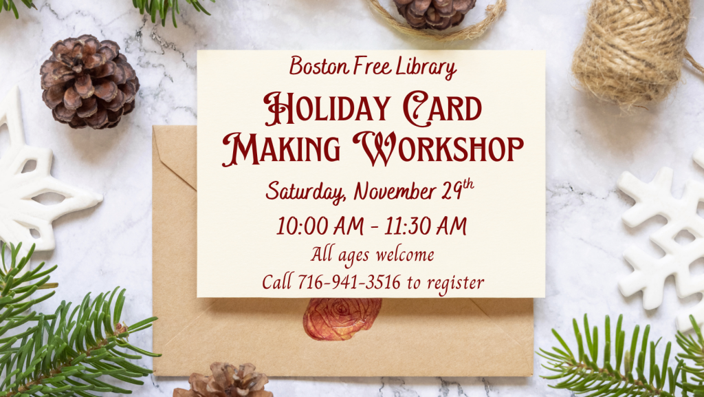 All ages welcome! We will have all the supplies necessary to make your own holiday greeting cards to send to friends and family. Create your own masterpieces to spread holiday cheer. Call 716-941-3516 to register to attend