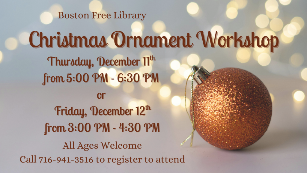 All ages welcome. December's craft will be Christmas Ornaments. We will have several different options available that are perfect for gifts or decorating your own tree. All supplies provided for free to pre-registered attendees. Call 716-941-3516 to reserve your spot!
