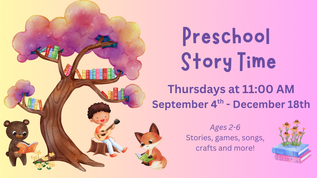 Preschool story time for children ages 2-6. Stories, games, songs, and more! Call 716-941-3516 to register.