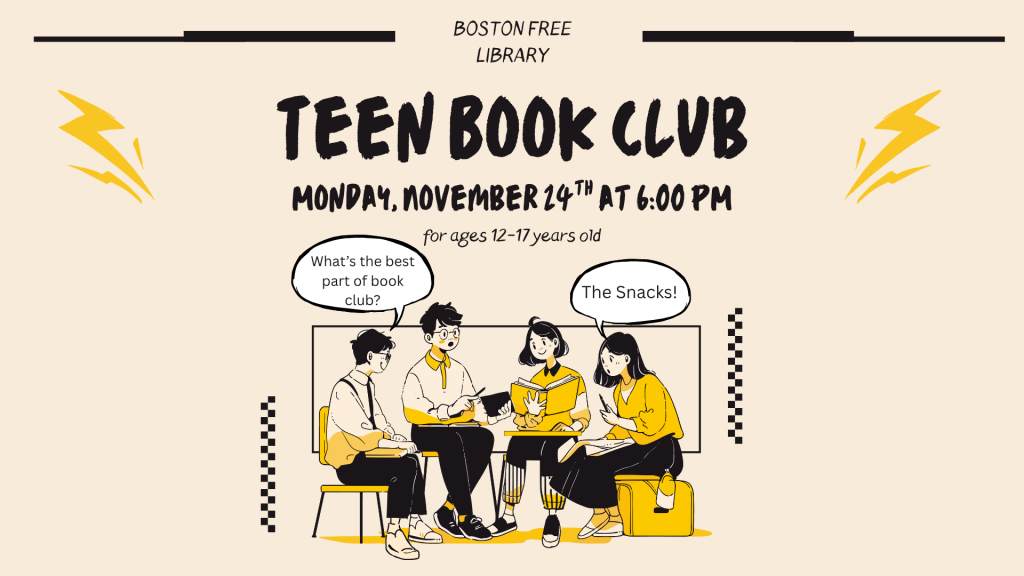 For ages 12-17. November's book selection is Witch and Wizard by James Patterson. Call 716-941-3516 to register.