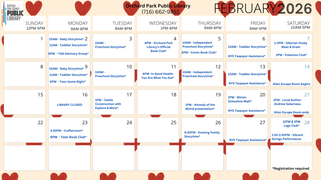 Registration is required. For more information, please call the Orchard Park Public Library at (716) 662-9851.