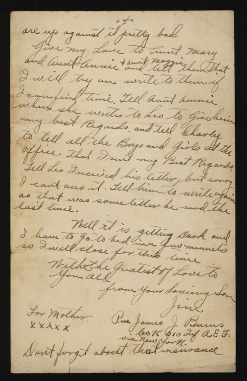 In his (first) May 10th letter from Camp Dix, “Jim” writes to his mother and makes sure she knows about the $10,000 life insurance policy he has taken out. He expresses how much he misses her. In the next (undated) letter to his parents from “Somewhere in England,” he writes “I am one homesick boy sometimes” but he feels good otherwise. He asks his parents to speak to the “insurance man” as he is concerned the policy he took out is void because he is “in service in a foreign land.”