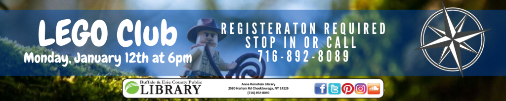 Join us in making your very own Lego creation to be displayed in the library. Call (716) 892-8089 or stop in at 2580 Harlem Rd Cheektowaga, NY to sign up. Registration is required..