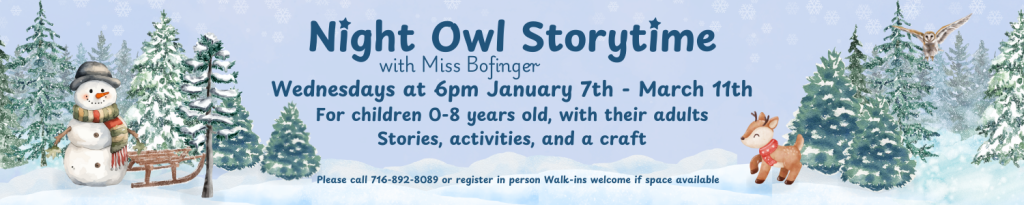 Night Owl Storytime with Miss Bofinger: Join us for stories, activities, and a craft. For children 0-8 years old, with their adults. Wednesdays at 6:00 pm from January 7th - March 11th. Please call 716-892-8089 or register in person at 2580 Harlem Rd Cheektowaga, NY 14225. Walk-ins welcome if space available.
