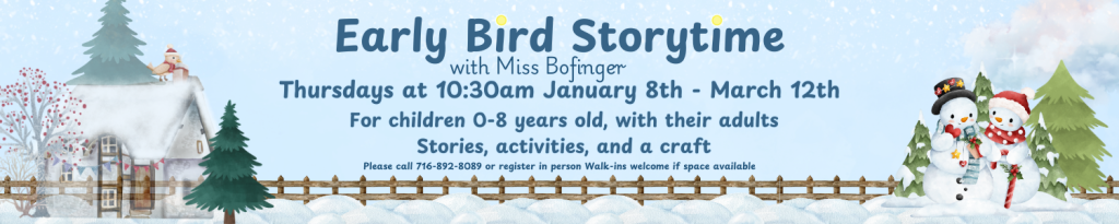 Early Bird Storytime with Miss Bofinger: Join us for stories, activities, and a craft. For children 0-8 years old, with their adults. Thursdays at 10:30am from January 8th - March 12th. Please call 716-892-8089 or register in person at 2580 Harlem Rd Cheektowaga, NY 14225. Walk-ins welcome if space available.