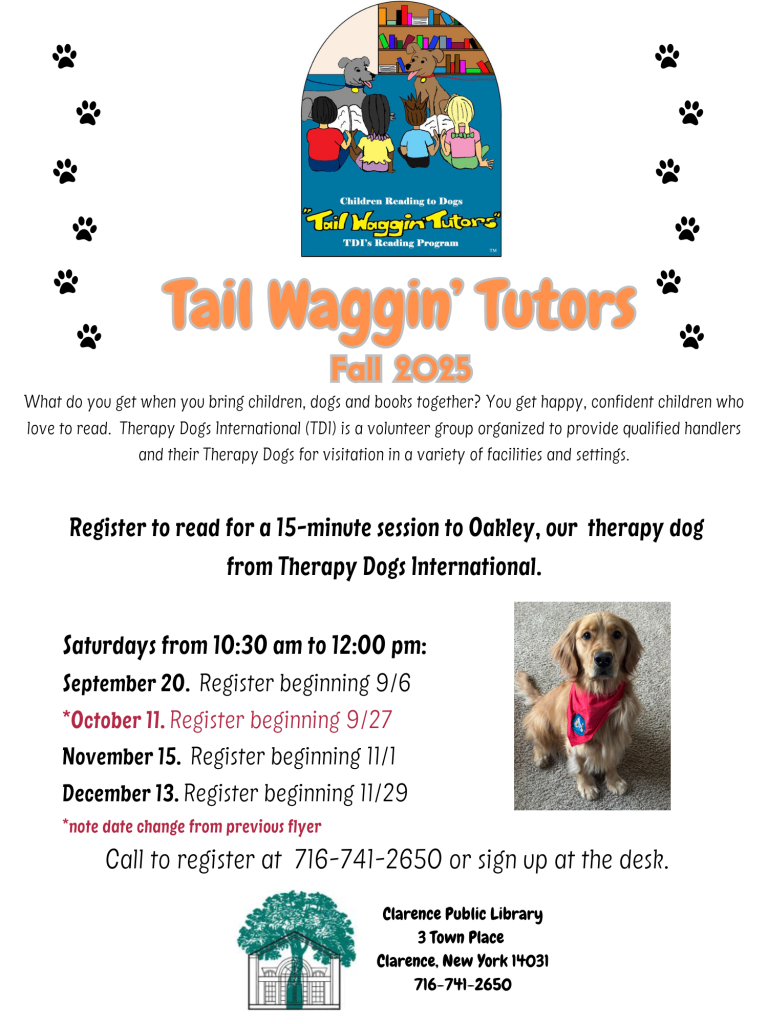 November 15, 2025, at 10:30-12:00 PM. Registration begins November 1. Therapy dog program. Read to Oakley.