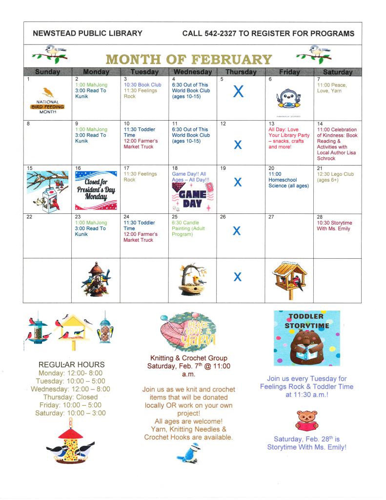 Virtual Programs - Join us for virtual FUN!!! Videos can be found on the Newstead Public Library Facebook page and YouTube channel.