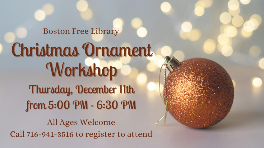 All ages welcome. December's craft will be Christmas Ornaments. We will have several different options available that are perfect for gifts or decorating your own tree. All supplies provided for free to pre-registered attendees. Call 716-941-3516 to reserve your spot!