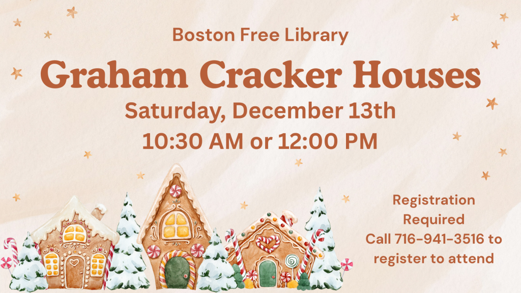 Join us for a tradition at the Boston Free Library. Create your own holiday graham cracker masterpiece. Supplies provided for all pre-registered attendees. Call 716-941-3516 to register. All ages welcome - young children must have an adult to help with this project.