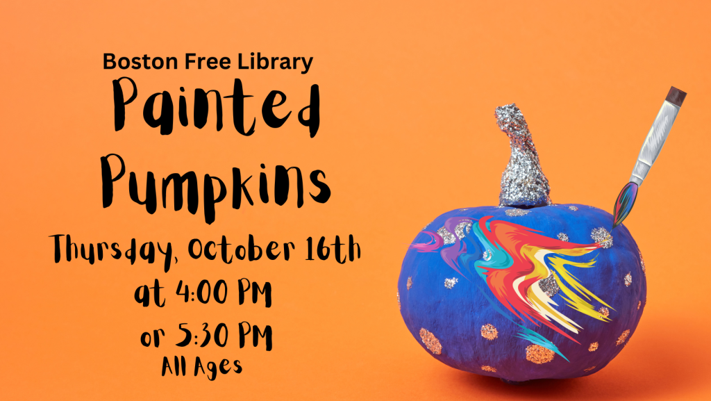 All ages welcome. October's craft is painted pumpkins! All supplies provided for free to pre-registered attendees. Registration is required, space is limited. Call 716-941-3516 to reserve your spot! Rain date (if necessary) will be October 23rd. Two sessions will be offered, one starting at 4:00 PM and the second starting at 5:30 PM. Please specify your time preference when registering.