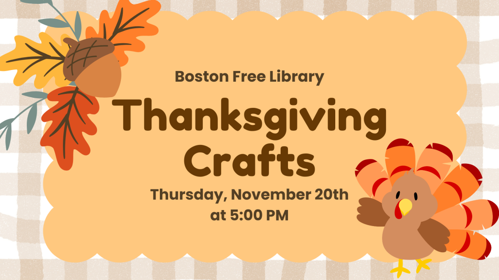 November's craft will focus on all things Thanksgiving: expect turkeys and table centerpieces! All ages welcome. All supplies provided for free to pre-registered attendees. Registration is required, space is limited. Call 716-941-3516 to reserve your spot!