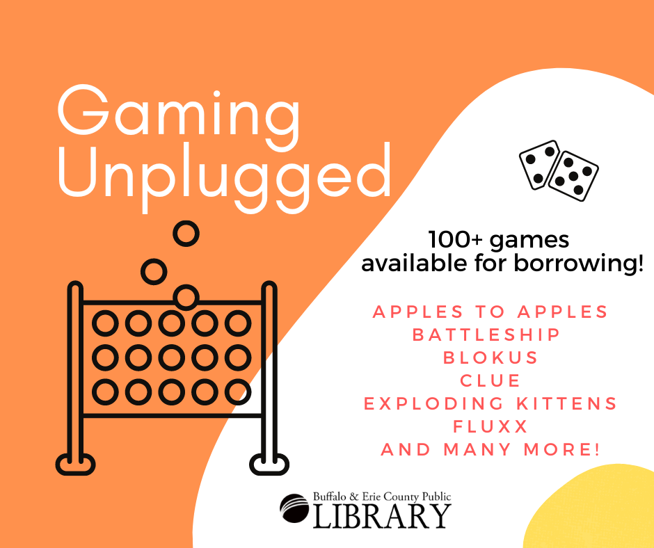 Did you know you can borrow games from your library? More than 100 games are available, from popular classics like Battleship to new favorites like Exploding Kittens. Call 716-858-7159 for details.
