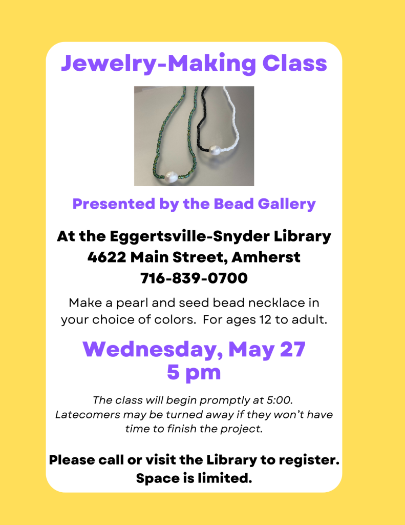May 12th, 26th, June 9th, and June 23rdTo sign up, come to the desk or call us at (716) 839-0700. Register soon! Space Limited.