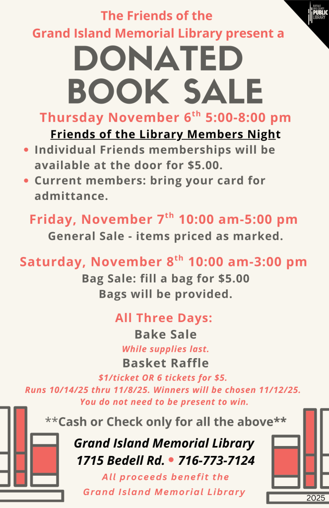 The library accepts material donations during open hours. Please call 716-773-7124 for the list of accepted materials.