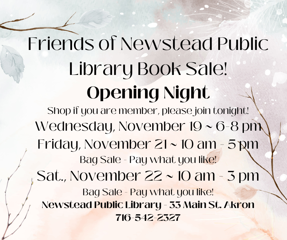 We have a very supportive Friends of the Library group that sponsors a used book sale in the Spring and Fall. There are three ways to become involved as a Friend: (1) as a member, (2) as a donor, and/or (3) as a volunteer. Please contact the Newstead Public Library for more information on how to become involved.