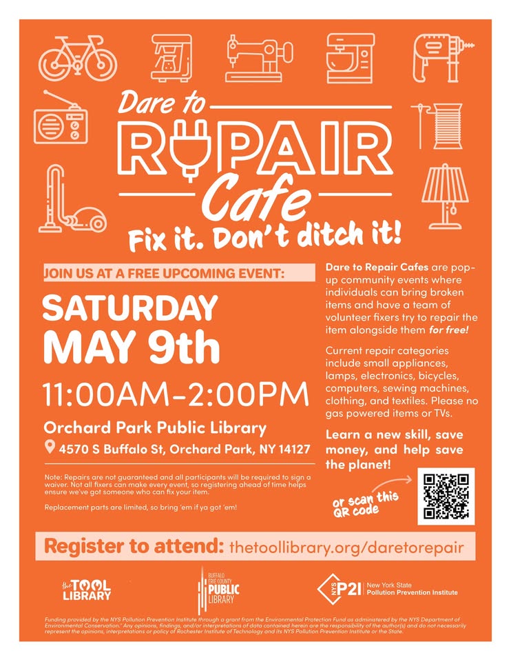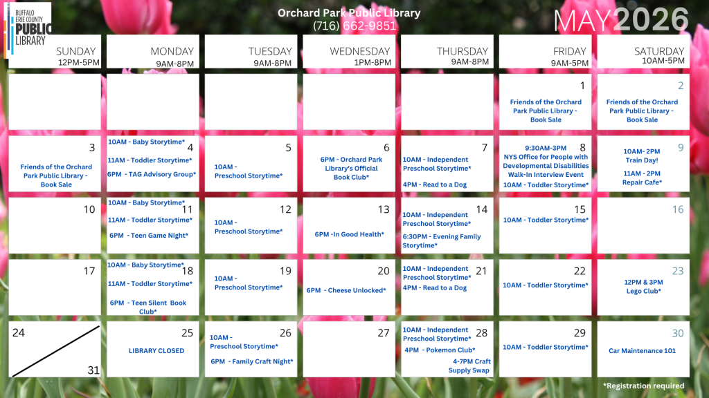 Registration is required. All supplies are limited. For more information, please call the Orchard Park Library at 662-9851.