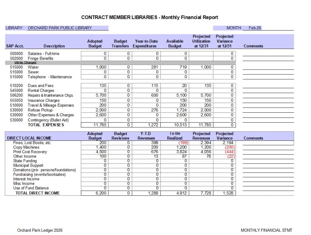 Agenda (pdf), Treasurer's Report (pdf), Voucher Expenditures (pdf), System Financial Report (pdf). Librarian's Report (pdf), 2023 Orchard Park Library System Contract (pdf)