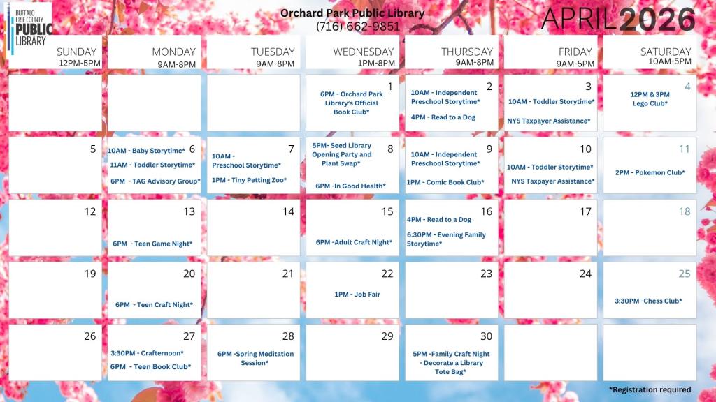 Registration for this event is encouraged. For more information, please call the Orchard Park Library at (716) 662-9851.