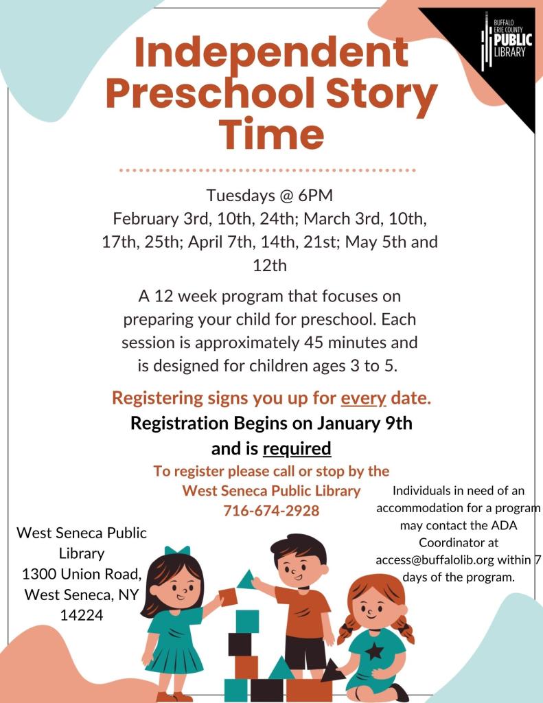 - Independent Preschool Story Time Winter/Spring 2026 Twelve Week Session (pdf)- Preschoolers ages 3-5 years can join Miss Emily on Tuesday nights at 6pm for a 12-week parent/guardian-free story time session. The dates are February 3rd, 10th, 24th; March 3rd, 10th, 17th, 24th; April 7th, 14th, 21st; May 5th and 12th. Space will be limited and registration is required. Signing up for one session signs the child up for all twelve sessions. Please note, if the parent does not call and the child does not show up 3 times, then they will be removed from the registration list. To register, please visit the library or call 716-674-2928.