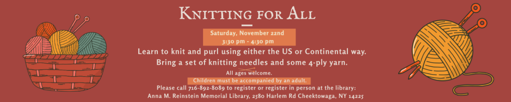 Learn to knit and purl using either the US or Continental way. Bring a set of knitting needles and some 4-ply yarn. Please call 716-892-8089 to register or register in person at 2580 Harlem Rd. Cheektowaga, NY 14225. All ages welcome! Children must be accompanied by an adult.