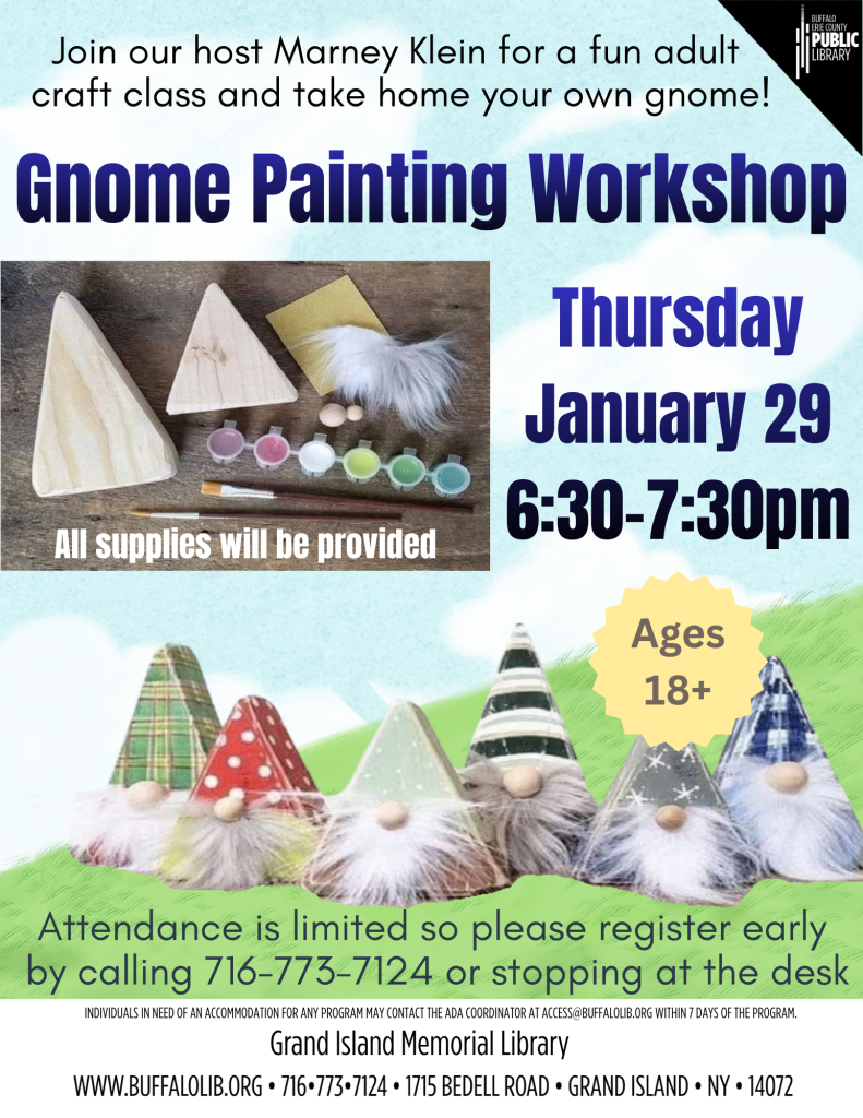 Adult Craft Night: Gnome Painting Workshop(png) Thursday, January 29th 6:30-7:30pm. Ages 18+. Registration is required. Please call 716-773-7124 to reserve your spot. All supplies will be provided.