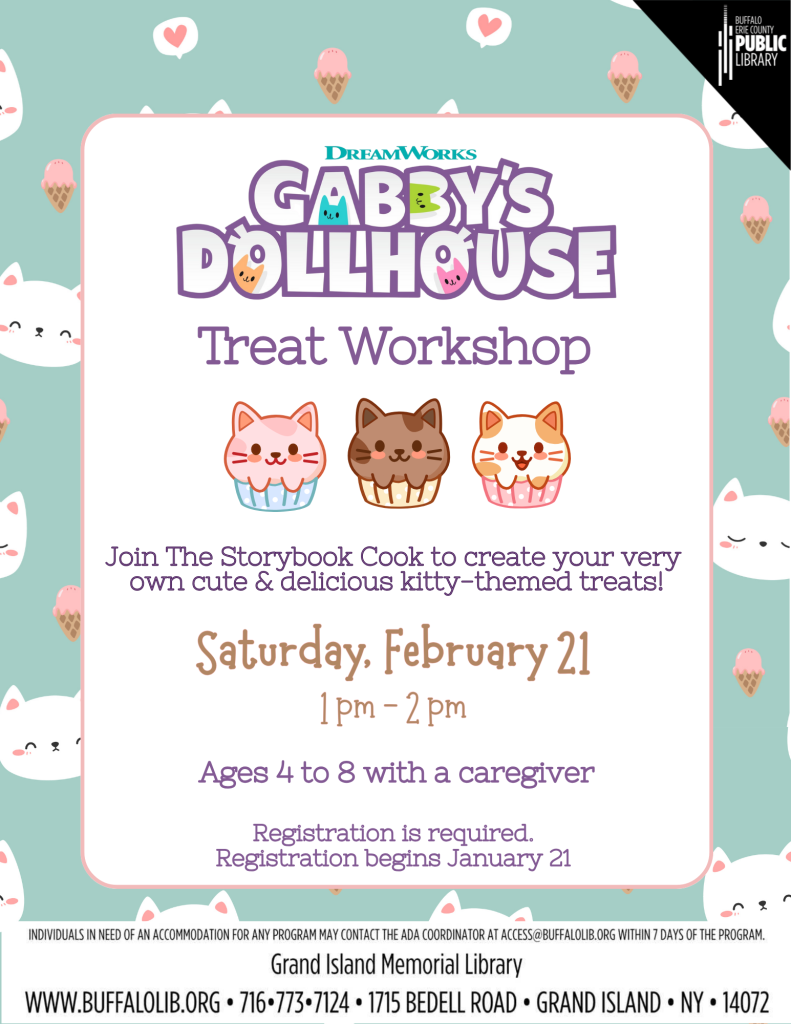 Gabby's Dollhouse Treat Workshop(png) Saturday, February 21st 1:00-2:00pm. **Registration is required and beings January 21st** Ages 4-8 with a caregiver. Join the Storybook Cook to create your very own cute & delicious kitty-themed treats!