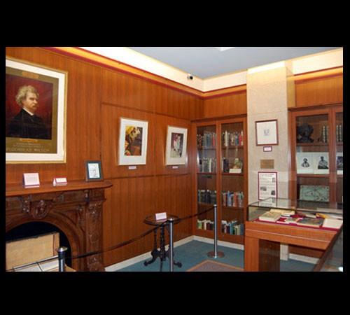 Made possible by public and private funding, including a $50,000 grant from the Margaret L. Wendt Foundation, the Mark Twain Room officially opened to the public on May 12, 1995. Leaves from the original handwritten manuscript of Adventures of Huckleberry Finn are on display in the center of the room.