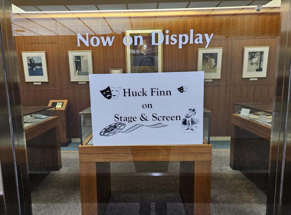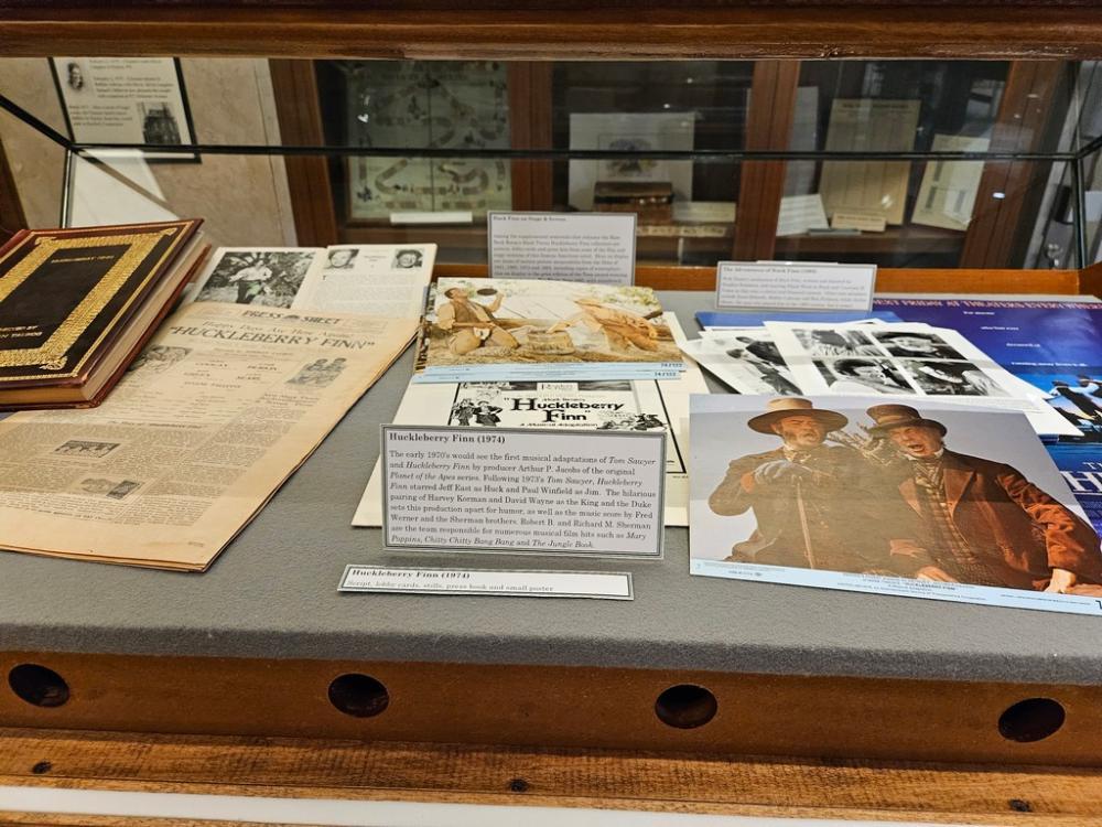 Among the supplemental materials that enhance the Rare Book Room’s Mark Twain Huckleberry Finn collection are posters, lobby cards and press kits from some of the film and stage versions of this famous American novel. Here on display are items of motion picture memorabilia from the films of 1931, 1960, 1974 and 1993, including copies of screenplays. Also on display is the print edition of the Tony award-winning musical production, Big River, from 1985, with soundtrack recordings and the musical score.
